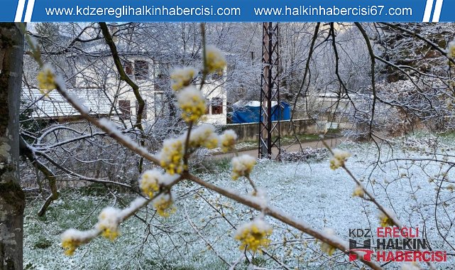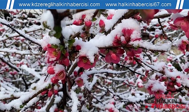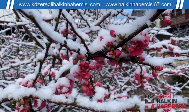 Baharla birlikte çiçek açan ağaçlar karla kaplandı