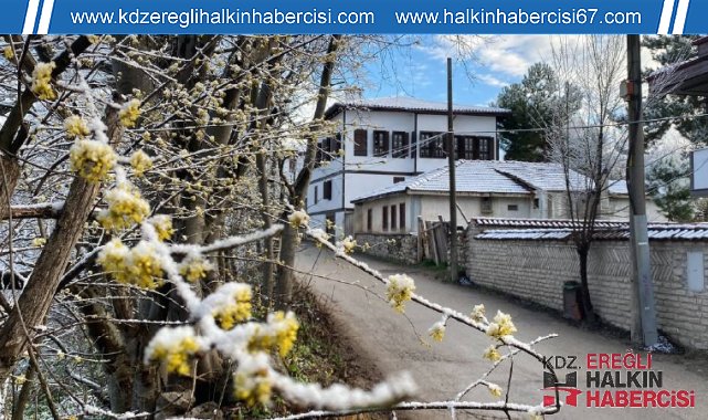 Karabük'ün Safranbolu ilçesindeki yüksek kesimler kar yağışı sonrası beyaza bürünürken, baharla birlikte çiçek açan ağaçlar da karla kaplandı.Dün gece itibariyle etkili olan kar yağışı sonrası Mart ayında Karabük'ün yüksek yüksek kesimleri beyaz örtüyle kaplandı.Esentepe Mahallesinde de tarihi evlerin çatıları beyaza büründü. Öte yandan baharın gelmesiyle çiçek açan ağaçlar da kar altında kalırken, kartpostallık görüntüler ortaya çıktı.Bu yıl yeterli seviyede kar görmediklerini belirten Hamdi Soykan, "Mart kapıdan baktırır kazma kürek yaktırır. Bütün mesele bu yani" dedi.