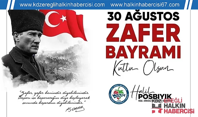 Kdz.Ereğli Belediye Başkanı Sayın Halil Posbıyık'ın 30 Ağustos Zafer Bayramı kutlama mesajı;"Aziz Milletimizin eşsiz kahramanlığı, bağımsızlık aşkı ve özgürlük iradesiyle kazanılan 30 Ağustos Zaferi’nin 103. yıl dönümünü, büyük bir gurur, coşku ve heyecanla idrak ediyoruz.26 Ağustos 1922’de başlayarak 30 Ağustos’ta zaferle sonuçlanan Büyük Taarruz, milletimizin bağımsızlık yolundaki en büyük dönüm noktalarından biri olmuş, esareti reddeden yüce Türk Milleti kendi geleceğini azim ve kararlılıkla tayin etmiştir. Gazi Mustafa Kemal Atatürk’ün başkomutanlığında, kahraman ordumuzun üstün mücadelesi ve milletimizin benzersiz fedakârlığıyla elde edilen bu büyük zafer, bağımsızlık ve özgürlük idealimizin en güçlü ifadesi olarak tarihe altın harflerle yazılmıştır.30 Ağustos; yalnızca bir askeri başarı değil, aynı zamanda Cumhuriyetimizin temellerinin atıldığı, milli birlik ve beraberlik ruhunun tüm dünyaya ilan edildiği tarihsel bir dönüm noktasıdır. Bugün en önemli görevimiz, atalarımızın canları pahasına emanet ettiği bu kutsal mirası korumak, Cumhuriyetimizin değerlerine sahip çıkmak ve ülkemizi daima daha ileriye taşımaktır.Bu anlamlı günde, Cumhuriyetimizin kurucusu Büyük Önder Gazi Mustafa Kemal Atatürk başta olmak üzere, tüm silah arkadaşlarını, aziz şehitlerimizi ve kahraman gazilerimizi rahmet, minnet ve şükranla anıyor; başta kıymetli hemşehrilerim olmak üzere tüm milletimizin 30 Ağustos Zafer Bayramı’nı en içten duygularımla kutluyorum."