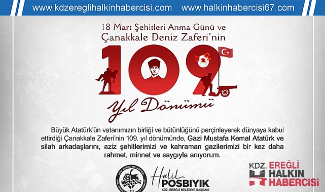 Kdz. Ereğli Belediye Başkanı Halil Posbıyık, 18 Mart Şehitleri Anma Günü ve Çanakkale Deniz Zaferi nedeniyle bir mesaj yayımladı.Kdz. Ereğli Belediye Başkanı Halil Posbıyık, 18 Mart Şehitleri Anma Günü ve Çanakkale Deniz Zaferi nedeniyle yayımladığı mesajında şu görüşlere yer verdi;“Çanakkale Zaferi, Gazi Mustafa Kemal Atatürk'ün "Ben size taarruzu emretmiyorum, ölmeyi emrediyorum." sözüyle, bir ulusun, vatan sevgisini, kardeşliği, birlik ve beraberlik ruhunu tüm dünyaya inançla kanıtladığı bir mücadelenin göstergesidir.109 yıl önce bugün "Çanakkale Geçilmez" dedirten kahramanlarımız, kendi topraklarımıza ve hürriyetimize sahip çıkma kararlılığımızı ortaya koymuş, tüm dünyaya bu milletin var oluş iradesinin yıkılamayacağını kanıtlamıştır.Bu yüzden imkânsızlıklar içinde çok büyük fedakârlıklar ile kazanılan Çanakkale Zaferi, sadece geçmişimizin bir aziz hatırası olarak değil, gelecek nesillere en güçlü ilham kaynaklarından biri olmaya devam edecektir.Milleti millet yapan şeylerden biri de ortak tarih bilincidir. Bugün, bizlere düşen en büyük görev, Atalarımızın bizlere bıraktığı mirasa sahip çıkarak, Çanakkale ruhunu, heyecanını ve kararlığını her zaman yaşatmaktır.Çanakkale Zaferi’nin 109. yıldönümünde, Cumhuriyetimizin kurucusu Gazi Mustafa Kemal Atatürk ve silah arkadaşları başta olmak üzere tüm kahramanlarımızı, vatanı uğruna canını bir an bile düşünmeden feda eden tüm şehitlerimizi saygı, rahmet ve minnetle anıyorum.#ÇanakkaleGeçilmez”