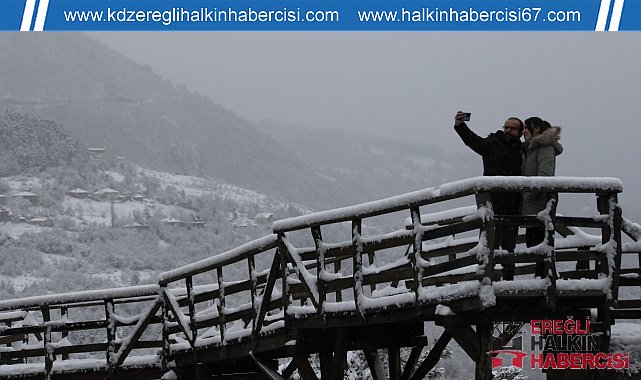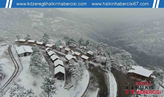 Karabük'ün Yenice ilçesinde etkili olan kar yağışı sonrası beyaz gelinliğini giyen Ihlamur Terası, kartpostallık görüntüleri ile görenleri kendine hayran bıraktı.