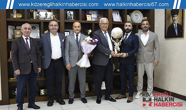İstanbul Kdz.Ereğlililer Derneği Başkanı Özkan Üstün ve yönetimi Kdz.Ereğli Belediye ve Kulüp Başkanı Halil Posbıyık’ı ziyaret ederken, “Her Eve Bir Forma” kampanyasına 100 adet forma alarak kulübe destek oldu.