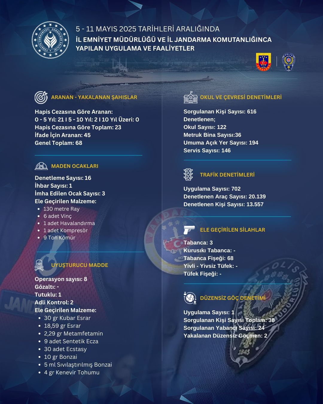 Zonguldak İl Emniyet Müdürlüğü ve İl Jandarma Komutanlığı tarafından 5 - 11 Mayıs 2025 tarihleri arasında il genelinde gerçekleştirilen uygulama ve denetimlerde çok sayıda aranan şahıs yakalanırken, uyuşturucu ve kaçak maden ocaklarına yönelik operasyonlar dikkat çekti.68 ARANAN ŞAHIS YAKALANDIHafta boyunca yapılan çalışmalarda çeşitli suçlardan aranan 68 kişi yakalandı. Bunların 23'ü kesinleşmiş hapis cezası nedeniyle aranırken, 45’i ifade için arandığının bilgili paylaşıldı.KAÇAK MADEN OCAKLARINA GEÇİT YOKKaçak maden ocaklarına yönelik denetimlerde ise 16 farklı noktada denetim yapıldı. 3 ocak imha edilirken, 130 metre ray, 6 vinç, 1 havalandırma, 1 kompresör ve 9 ton kömür ele geçirildi.UYUŞTURUCUYA DARBE: 8 OPERASYON, 1 TUTUKLAMAUyuşturucuyla mücadele kapsamında 8 operasyon düzenlendi. Yapılan aramalarda; 30 gram kubar esrar, 18,59 gram esrar, 2,29 gram metamfetamin, 9 sentetik ecza, 30 ecstasy, 10 gram bonzai, 5 ml sıvılaştırılmış bonzai ve 4 gram kenevir tohumu ele geçirildi. Operasyonlarda 1 kişi tutuklandı, 2 kişi hakkında adli kontrol kararı verildi.OKUL VE ÇEVRESİNDE SIKI DENETİMÖğrencilerin güvenliği için yapılan okul çevresi denetimlerinde 122 okul, 36 metruk bina, 194 umuma açık yer ve 146 servis aracı kontrol edildi. Bu kapsamda 616 kişi sorgulandı. TRAFİK DENETİMLERİ ARTIRILDI Kent genelinde yapılan 702 trafik uygulamasında 20 bin 139 araç ve 13 bin 557 kişi denetlendi.SİLAH VE DÜZENSİZ GÖÇ DENETİMLERİYapılan denetimlerde 3 tabanca ve 68 fişek ele geçirildi. Ayrıca düzensiz göçle mücadele kapsamında yapılan uygulamada 38 kişi sorgulandı, 2 düzensiz göçmen yakalandı.Yetkililer, huzur ve güven ortamının devamı için denetimlerin aralıksız süreceğini belirtti.