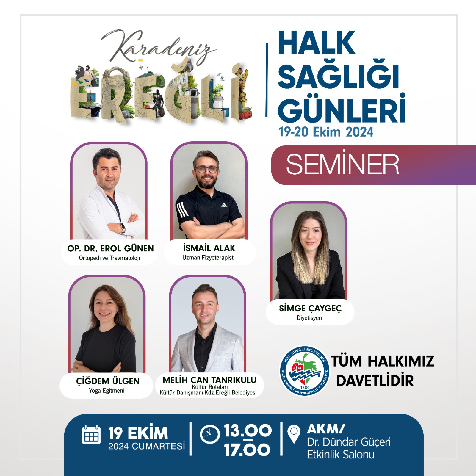 Kdz. Ereğli Belediyesi ev sahipliğinde düzenlenen Halk Sağlığı Günleri etkinlikleri kapsamında 19 Ekim Cumartesi günü saat 13.00-17.00 saatlerinde Atatürk Kültür Merkezi Dr. Dündar Güçeri Etkinlik Salonunda konusunda uzman isimlerin yer alacağı bilgilendirme semineri gerçekleştirilecek.