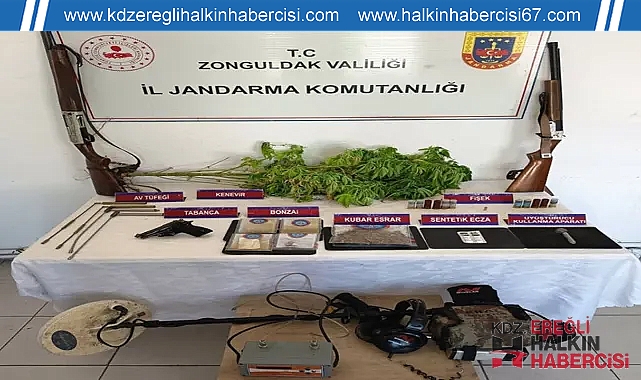 Zonguldak'ın Ereğli ilçesinde jandarma ekipleri tarafından yapılan aramalarda; uyuşturucu, tabanca, tüfek ve fişek ele geçirildi. Olayla ilgili gözaltına alınan 3 şüpheliden 2'si tutuklandı.Konuyla ilgili Zonguldak Valiliğinden yapılan açıklama şöyle:"Zonguldak İl Jandarma Komutanlığınca 27 Ağustos 2025 günü Adli Makamlardan alınan arama kararına istinaden Ereğli İlçesi mülki sınırları içerisinde 3 adreste icra edilen eş zamanlı aramada; 47 Gram Kubar Esrar, 30 Gram Bonzai, 6 Adet Sentetik Ecza Hap, 1 Kök Kenevir, 1 Adet Ruhsatsız Tabanca ve Şarjör, 2 Adet Ruhsatsız Av Tüfeği, 11 Adet Av Tüfeği Fişeği, 1 Adet Tabanca Fişeği, 1 Adet El Dedektörü, 4 Adet Define Arama Çubuğu, 1 Adet Uyuşturucu Madde Kullanma Aparatı, 2 Adet Cep Telefonu ele geçirilmiş ve 3 şüpheli şahıs yakalanmıştır.Olayla ilgili Cumhuriyet Başsavcılığının talimatları doğrultusunda şüpheli 1 şahıs ifadesi alınarak serbest bırakılmış, Adli Makamlara sevk edilen şüpheli 2 şahıs ise tutuklanmıştır.Kamuoyuna saygı ile duyurulur."