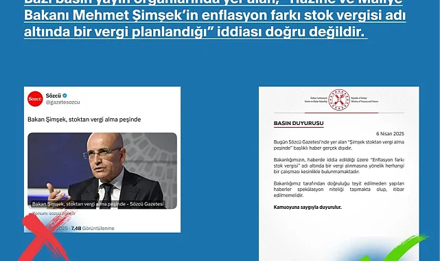 Bazı basın yayın organlarında yer alan, "Hazine ve Maliye Bakanı Mehmet Şimşek'in enflasyon farkı stok vergisi adı altında bir vergi planladığı" iddiasının doğru olmadığı açıklandı.