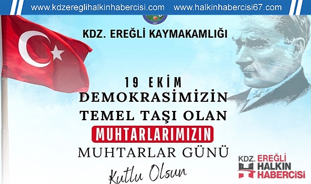 19 Ekim Muhtarlar Günü nedeni ile yayın kurulumuza ulaşan kutlama mesajları şöyle :ZONGULDAK VALİSİ OSMAN HACIBEKTAŞOĞLU:Muhtarlarımız, yerel yönetimlerin temel unsurları olarak halkımızın taleplerini ilk elden karşılayan, sorunlarını çözme konusunda öncü olan ve devlet ile vatandaş arasında güçlü bir bağ kuran değerli temsilcilerdir. Özellikle köylerimizde ve mahallelerimizde kamu hizmetlerinin en etkin şekilde yürütülmesinde önemli bir görev üstlenen muhtarlarımız, halkımızın huzuru, refahı ve güvenliği için büyük bir özveriyle çalışmaktadır. Bulundukları bölgelerde vatandaşlarımızın taleplerini göz önünde bulundurarak toplumsal dayanışma, kardeşlik ve yardımlaşma ruhunu canlı tutmaktadırlar.Muhtarlarımız, halkın temsilcisi olmanın getirdiği sorumluluğu layıkıyla yerine getirirken, yerel sorunlara kalıcı çözümler üretme konusunda önemli bir köprü vazifesi görmektedirler. Bulundukları mahalle ve köylerde kamu hizmetlerinin kesintisiz sürdürülmesine büyük katkı sağlamaktadırlar.Bu anlamlı günde, köylerimizde ve mahallelerimizde fedakârca görev yapan tüm muhtarlarımızın 19 Ekim Muhtarlar Günü’nü içtenlikle kutluyorum. Üstlendikleri sorumlulukları büyük bir başarıyla yerine getiren muhtarlarımızın, vatandaşlarımıza sundukları hizmetlerin her zaman takdirle karşılandığını belirtmek isterim. Kendilerine görevlerinde üstün başarılar diliyor, aileleri ile birlikte sağlıklı, mutlu ve huzurlu bir yaşam temenni ediyorum.