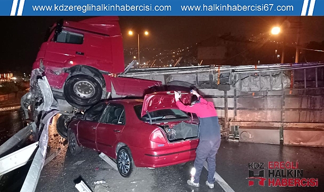 Zonguldak'ın Kozlu ilçesinde seyir halindeki odun yüklü tır yola devrildi. Kazada tırın çarptığı aracın sürücüsü yaralandı.Edinilen bilgiye göre kaza akşam saatlerinde Kozlu ilçesi Fatih Sitesi mevkisinde yaşandı. Yağışlı havanın etkisiyle sürücüsü öğrenilemeyen 67 AAT 849 plakalı odun yüklü tır kontrolden çıkarak devrildi.Tır, 67 ABR 197 plakalı otomobil ile çarpıştı. Refüje çıkan tır karşı yönden gelen 67 ACV 851 plakalı araçlara çarptı. Araç sürücüsü kazada yaralandı. Olay yerine ulaşan sağlık personeli yaralıyı ilk müdahalenin ardından, ambulansla hastaneye kaldırdı. Trafik bir müddet kontrollü olarak sağlanırken, kaza nedeniyle yol trafiğe kapandı. Kazayla ilgili soruşturma başlatıldı.