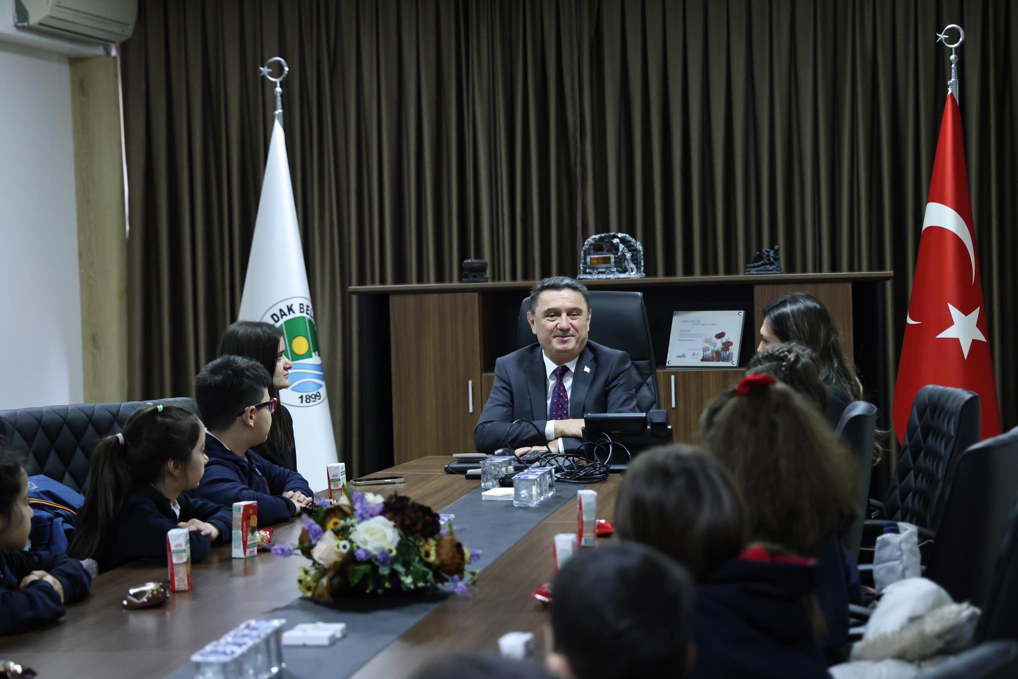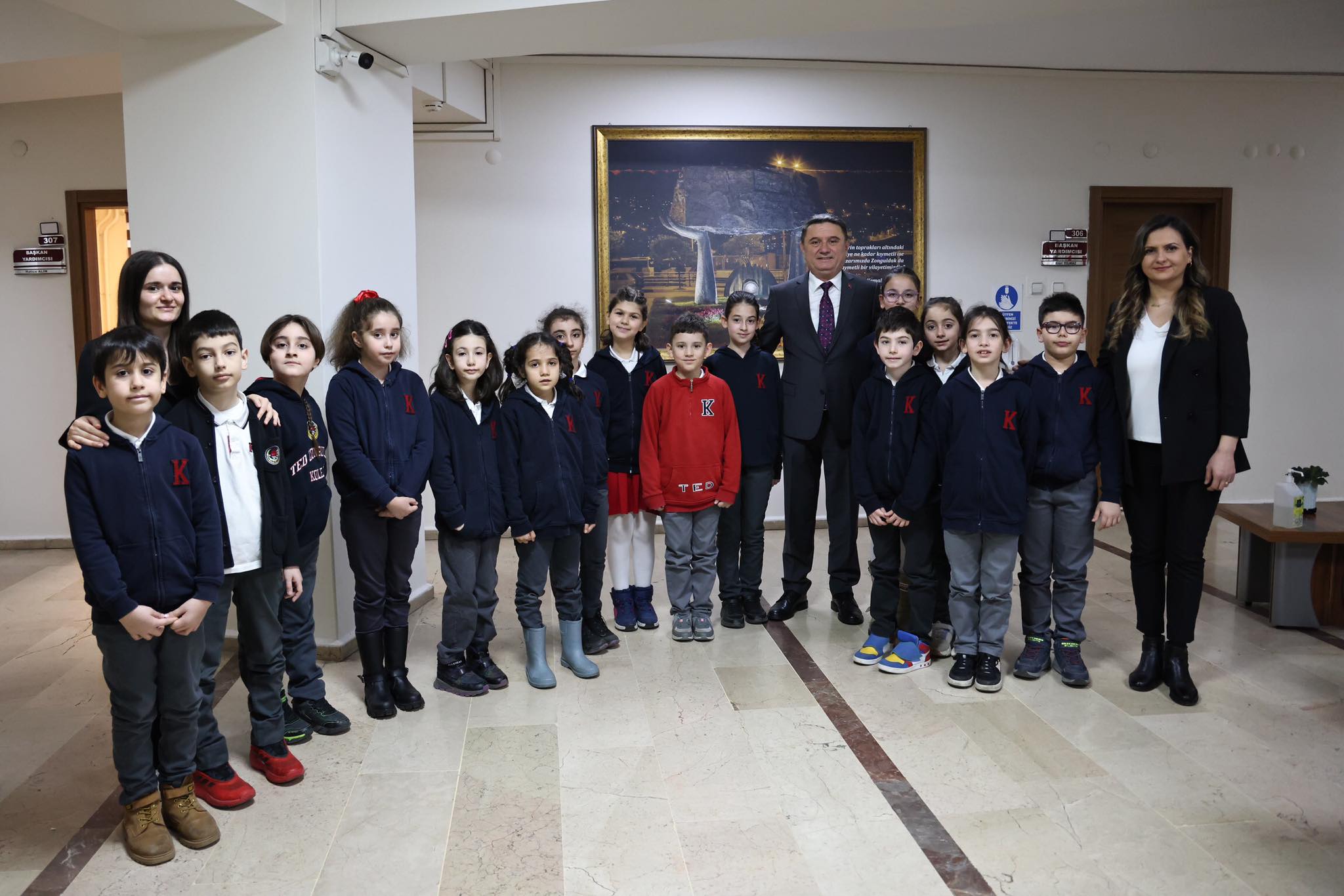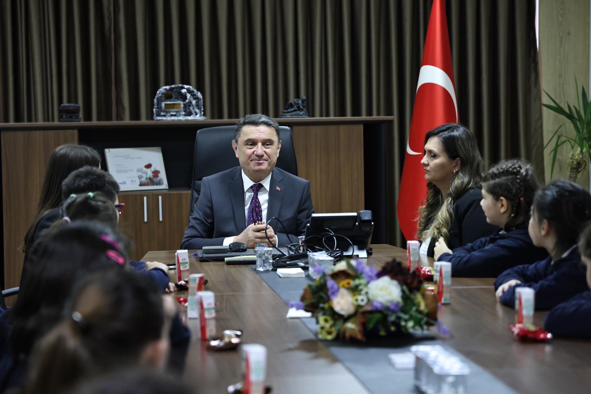 Minik öğrenciler, yerel yönetimlerin işleyişini öğrenmek ve belediye hizmetleri hakkında bilgi almak amacıyla gerçekleştirdikleri ziyarette, Başkan Erdem’le keyifli bir sohbet gerçekleştirdi.Belediye Başkanı Tahsin Erdem, öğrencilerimize yerel yönetimlerin işlevlerinden bahsetti, minik öğrencilerimizin merak ettikleri sorularını içtenlikle yanıtladı. Belediye Başkanı Tahsin Erdem’i soru yağmuruna tutan minikler isteklerini bir bir sıraladılar.
