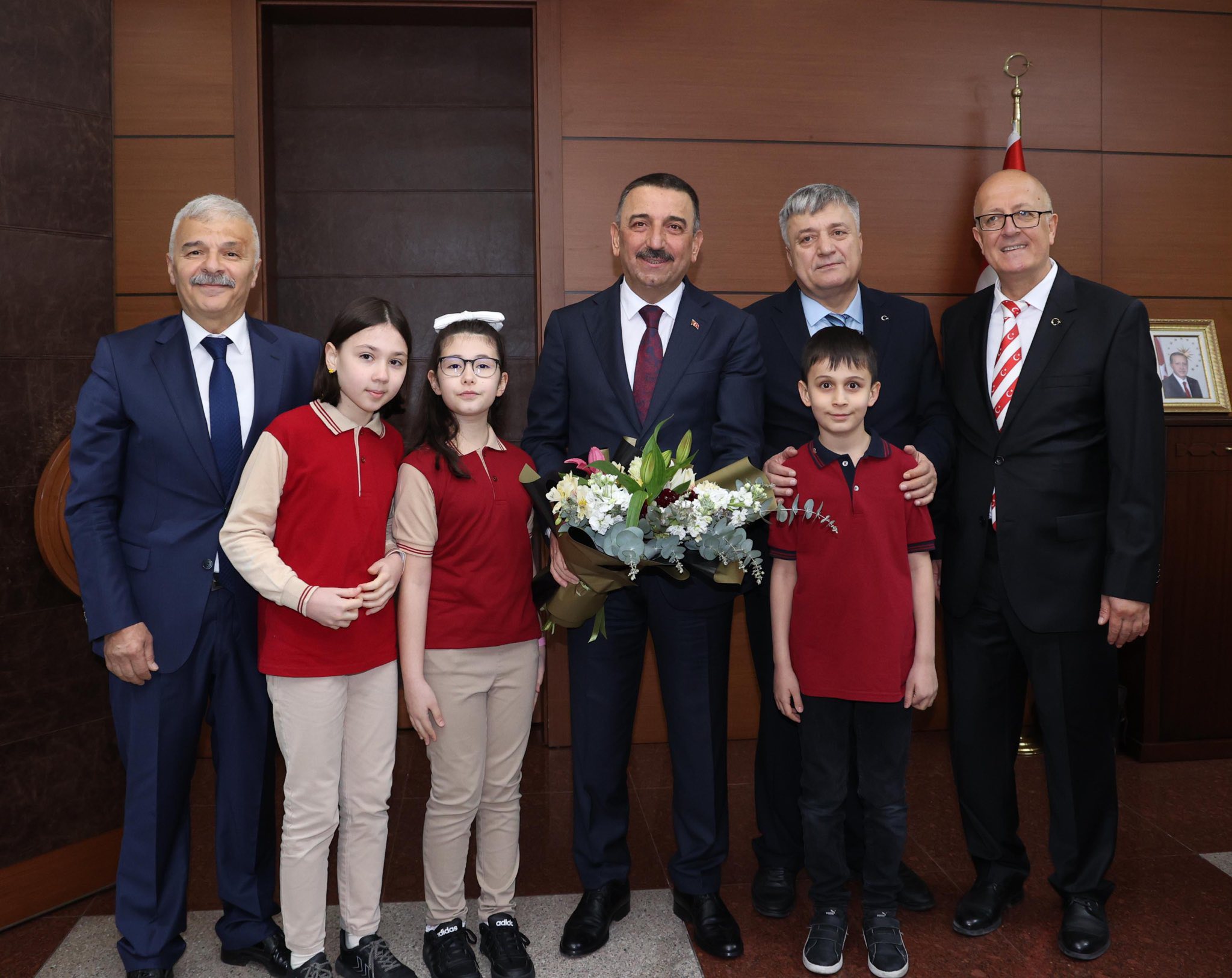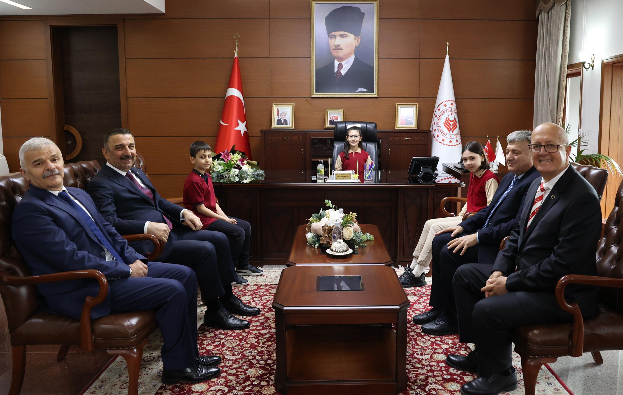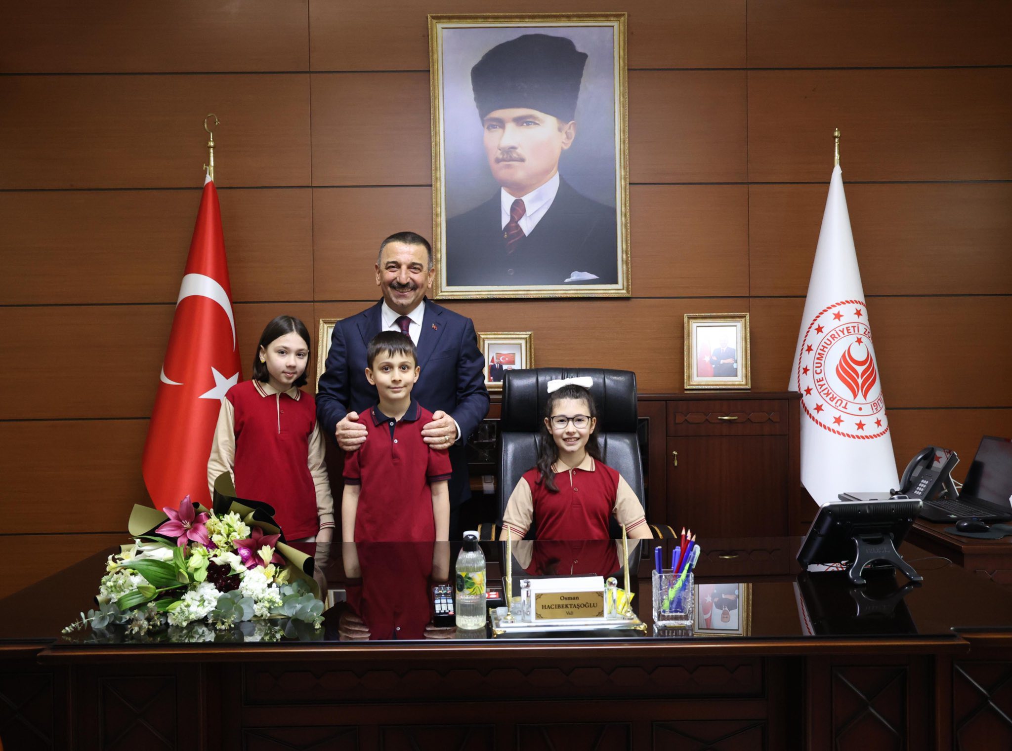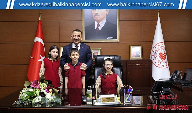 Ulusal Egemenlik ve Çocuk Bayramı’nın 105’inci yıl kutlama etkinlikleri kapsamında İl Milli Eğitim Müdürü Osman Bozkan ve Dr. Derviş Nihat Arkat İlkokulu öğrencileri, Zonguldak Valisi Osman Hacıbektaşooğlu’nu makamında ziyaret etti. Ziyarette; Okul Müdürü Mustafa Girgin, 4-B Sınıfı Öğretmeni Abdullah Turmuş, öğrenciler İlge Yılmaz, Ece Doğrukartal, Deniz Tekir de hazır bulundu. Vali Osman Hacıbektaşoğlu, makam koltuğunu 4-B sınıfından İlge Yılmaz’a devretti.