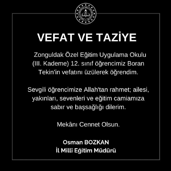 Zonguldak Özel Eğitim Uygulama Okulu (III. Kademe) 12. sınıf öğrencisi Dr. Yasin Tekin’in oğlu Boran Tekin, sabah saatlerinde hayatını kaybetti. Bir süredir ciddi solunum sıkıntısı yaşayan Tekin, Zonguldak Bülent Ecevit Üniversitesi Tıp Fakültesi Hastanesi’nde tedavi görüyordu.Cenaze töreninde annesi ve babası tabutun başında gözyaşları döktüler. Boran Tekin’in cenazesi, bugün ikindi namazına müteakip Aziziye Camii’nde kılınan cenaze namazının ardından, sevenlerinin gözyaşları arasında Aile Mezarlığı’nda toprağa verildi.Cenaze törenine çok sayıda vatandaş, aile dostları ve Boran’ın arkadaşları katıldı.Zonguldak İl Milli Eğitim Müdürü Osman Bozkan, yayımladığı taziye mesajında, "Sevgili öğrencimize Allah’tan rahmet; ailesi, yakınları, sevenleri ve eğitim camiamıza sabır ve başsağlığı dilerim. Mekânı cennet olsun" ifadelerine yer verdi.