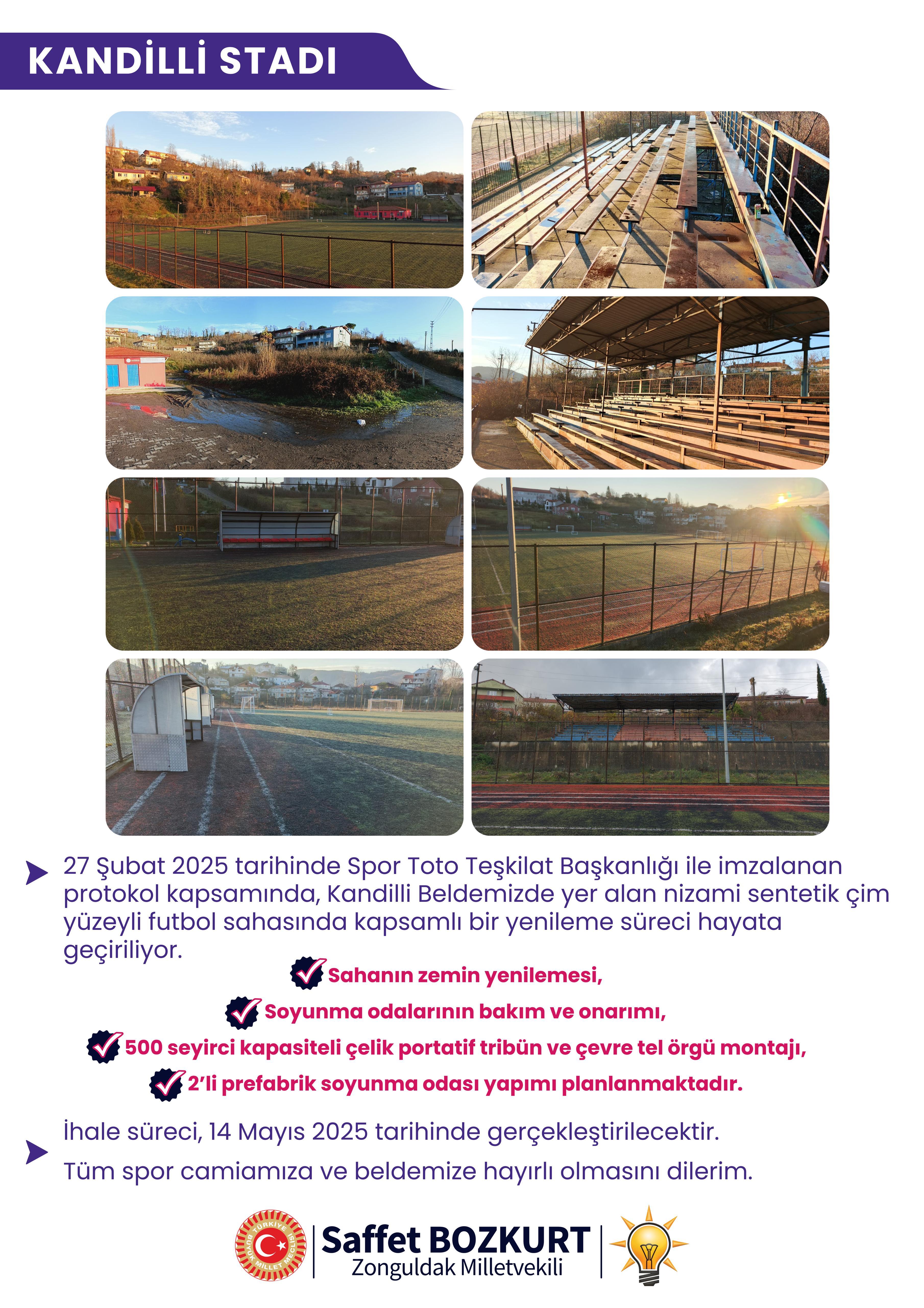 Adalet ve Kalkınma Partisi (AK Parti) Zonguldak Milletvekili Saffet Bozkurt, 27 Şubat 2025 tarihinde Spor Toto Teşkilat Başkanlığı ile imzalanan protokol kapsamında Kandilli Beldesi’nde yer alan futbol sahasında yenileme sürecinin başlangıcının startını verdi.