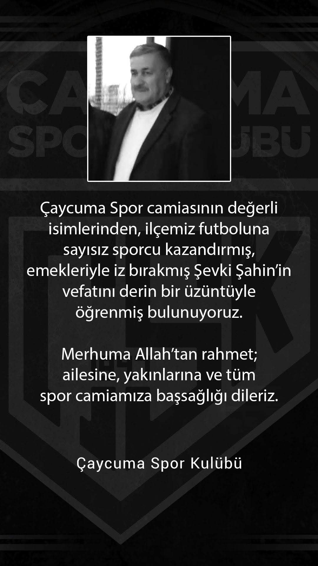 Çaycumaspor Kulübü, Zonguldak 2. Amatör Küme ekiplerinden Veli Köyü Spor Kulübü'nün eski Genel Sekreteri Şevki Şahin'in vefat ettiğini duyurdu.Sarı-lacivertli kulüpten yapılan açıklamada, Şahin'in Çaycuma futboluna ve Çaycumaspor'a çok sayıda futbolcu kazandırdığı belirtilerek vefatından duyulan üzüntü dile getirildi. Kdz.Ereğli Halkın habercisi olarak, merhuma Allah'tan rahmet; kederli ailesi ile yakınlarına başsağlığı ve sabır diliyoruz.Açıklama şöyle:
