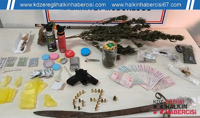 Zonguldak'ta ekiplerce yapılan geniş çaplı uyuşturucu operasyonunda yakalanan 18 şüpheliden 6'sı gözaltına alındı. Diğer şüpheliler ise ifadelerinin alınmasının ardından serbest bırakıldı. Zonguldak'ın Alaplı ilçesinde uyuşturucu madde ticareti yapan, kullanan şahıslara yönelik 22 şüphelinin yakalanması ve suç delillerinin ele geçirilmesi amacıyla 101 personelin katılımıyla müşterek operasyon düzenlendi. Operasyonda 18 şüpheli yakalandı. Şüphelilerden 6'sı Cumhuriyet Savcısının talimatıyla gözaltına alındı. Diğer şüpheliler alınan ifadelerinin ardından serbest bırakıldı. 11 adreste yapılan aramalarda; uyuşturucu madde ticaretine ait bulgular ile 50 gram esrar, bir kök Hint keneviri, 3 gram metamfetamin, 4 gram kenevir tohumu, bir adet hassas terazi, 12 bin 195 TL nakit para, bir adet ruhsatsız tabanca, 28 adet tabanca fişeği, 31 adet çeşitli isimlerde yeşil reçeteli hap, bir adet kılıç ve 3 adet payp ele geçirildi. Şüphelilerin sorgusu sürüyor.