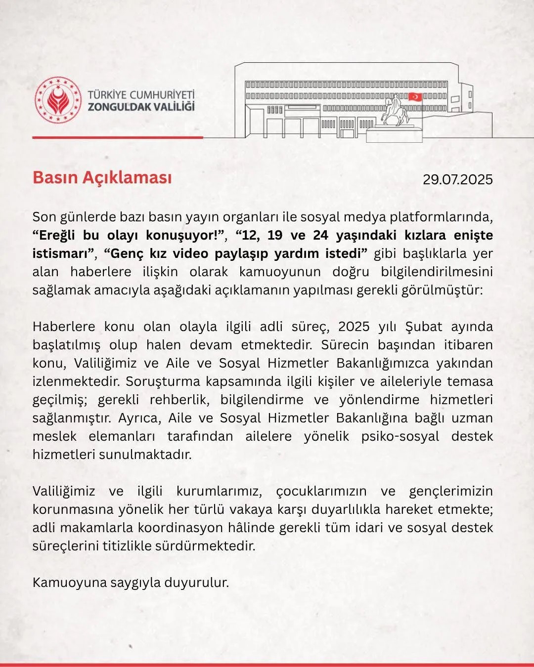 Karadeniz Ereğli'de genç bir kız, yaptığı paylaşımda eniştesi tarafından kendisi ve 2 kız kardeşinin enişteleri tarafından tac i ze uğradığını ve bunu yakın akrabalarının da bildiğini belirterek yardım istemişti. Geçtiğimiz şubat ayında adli süreci başlayan olay sosyal medyada yeniden çıkıp haber sitelerinde yer alınca Zonguldak Valiliği bilgilendirme açıklaması yaptı.Valilikten gönderilen açıklama şu şekilde:"Son günlerde bazı yayın organları ile sosyal medya platformlarında, 'Ereğli bu olayı konuşuyor', '12, 19 ve 24 yaşındaki kızlara enişte istismarı', 'Genç kız video paylaşıp yardım istedi' gibi başlıklarla yer alan haberlere ilişkin kamuoyunun doğru bilgilendirilmesini sağlamak amacıyla açıklama yapma gereği görülmüştür.ADLİ SÜREÇ ŞUBAT'TA BAŞLATILDIHaberlere konu olan olayla ilgili adli süreç 2025 yılı Şubat ayında başlatılmış olup halen devam etmektedir. Sürecin başından itibaren konu valiliğimiz ve Aile ve Sosyal Hizmetler Bakanlığımızca yakından izlenmektedir. Soruşturma kapsamında ilgili kişiler ve aileleriyle temasa geçilmiş, gerekli rehberli, bilgilendirme ve yönlendirme hizmetleri sağlanmıştır. Ayrıca, Aile ve Sosyal Hizmetler Bakanlığı'na bağlı uzman meslek elemanları tarafından ailelere yönelik psiko-sosyal destek hizmetleri sunulmaktadır. Valiliğimiz ile ilgili kurumlarımız, çocuklarımızın ve gençlerimizin korunmasına yönelik her türlü vakaya karşı duyarlılıkla hareket etmekte, adli makamlarla koordinasyon halinde gerekli tüm idari ve sosyal destek süreçleri titizlikle sürdürmektedir."