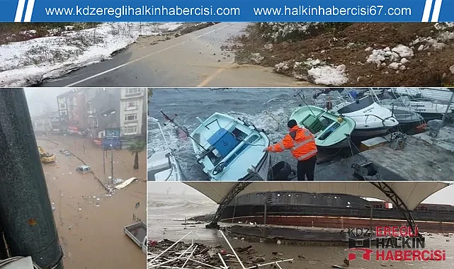 Zonguldak ve çevresinde dün gece başlayan şiddetli sağanak yağış ve kuvvetli fırtına hayatı adeta felç etti. Zonguldak-Ereğli karayolunda üç ayrı noktada heyelan meydana geldi. Polis ve jandarma ekipleri sürücüleri uyararak, yolun kapalı olması sebebiyle alternatif güzergahlara yönlendirdi.İl genelinde etkili olan kuvvetli yağış ve fırtına hayatı olumsuz etkiledi. Kdz. Ereğli ilçesinde karaya oturan yük gemisinin mürettebatı tahliye edildi. Kamerun bandralı Pallada isimli yük gemisinde büyük hasar meydana geldi. Kdz. Ereğli ilçesindeki sahil ve ilçe merkezindeki dereler taşınca iş yerleri de zarar gördü. Kaldırımlardaki parke taşlar ve ağaçlar fırtınayla birlikte çevreye savruldu. Öte yandan Zonguldak-Ereğli karayolunda üç ayrı noktada meydana gelen heyelanlar uzun araç kuyrukları oluşmasına neden oldu. Bölge trafik ve jandarma ekipleri, güvenlik gerekçesiyle araçların geçişine izin vermezken, heyelanın meydana geldiği bölgelere acil olarak iş makinaları ve kamyonlar sevk edildi. Bazı noktalarda trafik neredeyse durma noktasına gelirken, bazı araçlar maddi hasarlı kazalara karıştı.Yetkililer, yolun en kısa sürede temizlenerek trafiğe açılması için yoğun çaba harcıyor. Yetkililer vatandaşları dikkatli olmaları konusunda uyarırken, yeni heyelanlar için de tedbirler alınmaya devam ediyor.Ilıksu Deresi de şiddetli yağışın ardından yükseldi. Yolla birleşen dere denize aktı. Vatandaşlar da tedbirlerini alarak derenin debisinin azalmasını bekledi.