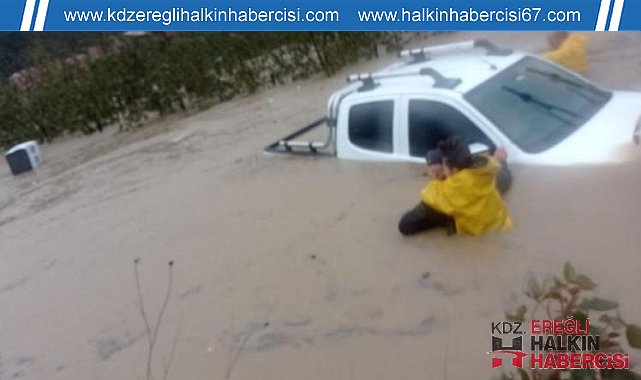 Kdz.Ereğli'de selin ortasında araçta mahsur kalan 4 kişi ve 2 köpek kurtarıldı