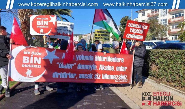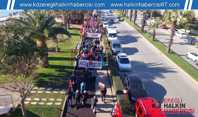 Zonguldak'ın Ereğli ilçesinde, teröre tepki ve Gazze'ye destek için yürüyüş gerçekleştirildi.Atatürk Bulvarı önünde bir araya gelen grup, ellerinde Türk ve Filistin bayraklarıyla sahil güzergahından Gazi Alemdar Müze Gemisi önüne kadar yürüdü. Terör örgütü PKK ile İsrail aleyhine slogan atan katılımcılar, kendileri için ayrılan alanda toplandı. Burada Kur'an-ı Kerim okundu.Karadeniz Ereğli Ümmet Platformu Sözcüsü Mustafa Köseoğlu, burada yaptığı konuşmada, Irak'ın kuzeyindeki Pençe-Kilit Harekatı bölgesinde teröristlerle çıkan çatışmada şehit olan askerlere Allah'tan rahmet, yaralılara şifa diledi. Saldırıların faillerini bildiklerini anlatan Köseoğlu, "Bölücü eşkıya talimat aldığı Amerika, Avrupa ve İsrail'in taşeronluğunu yapıyor. Askerimize saldıran terörist eşkıya ile Gazze'ye 100 gündür ölüm yağdıranların patronları aynıdır. Türkiye'nin Ortadoğu siyasetinden ve İsrail zulmünü dünyaya duyurmasından rahatsızlık duyan, siyonizm yönetimindeki küresel sömürgeci düzenin en önemli temsilcisi ABD'nin ve peşinden giden batılı devletlerin ilkemize bedel ödetmeye çalıştığını hep beraber görüyoruz. Filistin benim neyim olur diye soranlara diyoruz ki Filistin-Gazze bizim vicdanımızdır" dedi.İnsanlık tarihinin en büyük zulümlerinden birine şahitlik ettiğini belirten Köseoğlu, şunları söyledi:"Terörist rejim işgalci İsrail, kadın, çocuk, yaşlı ve sivil ayırt etmeksizin Gazze'de soykırım suçu işliyor. Yaşanan bu işgal ve soykırım, vicdan sahibi yürekleri dağlıyor, başta bölgemiz olmak üzere tüm dünyanın huzuruna kastediyor. Son bilgilere göre Filistin'de 10 binden fazla çocuk, 7 binden fazla kadın olmak üzere 23 bini aşkın insan hayatını kaybetti. 60 binden fazla kişi yaralanırken, 8 bin kişi ise kayıp. İşgalci İsrail'in saldırıları sebebiyle ayrıca, 69 bini tamamen yıkılmış olmak üzere, 359 bin ev zarar gördü. 2 milyon sivil ise saldırılar sonucu Gazze içerisinde zorla göç ettirildi. On binlerce insan 2024 yılında dünyanın gözü önünde açlık ve susuzluk sebebiyle ölüm tehlikesiyle karşı karşıya kalmış durumda."Konuşmanın ardından katılımcılar dua etti.
